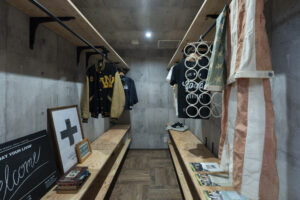 ●自転車などアウトドアライフを楽しめる、有効ボードやOSB合板などラフな素材感を取り入れた玄関スペース